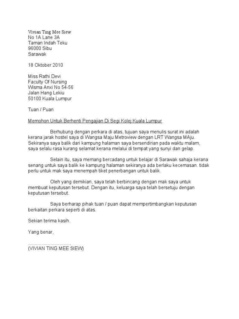 Surat rasmi berhenti belajar uitm nice info c. 18 Oktober2010 Miss Rathi Devi FacultyOf Nursing WismaAnxi No 54-56 JalanHang Lekiu 50100 KualaLumpur Tuan Puan. 03 41427071 03 41427072 no fax.
